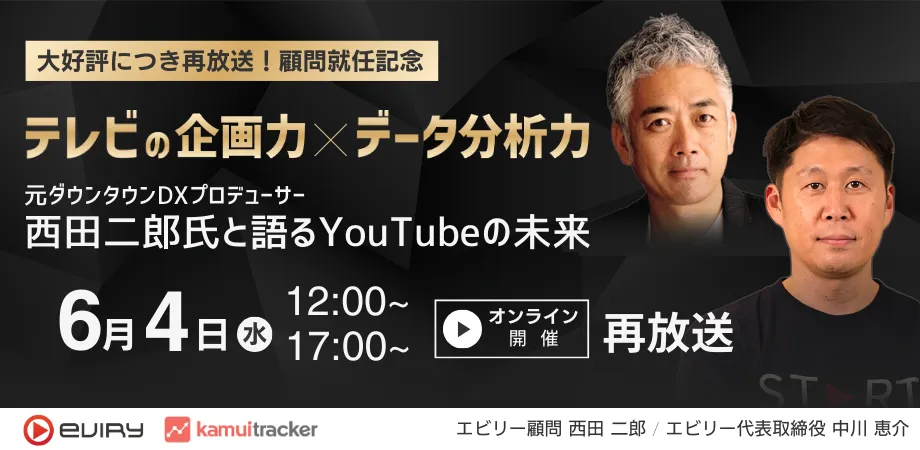 2025年5月20日に開催した顧問就任記念トークイベント「テレビの企画力×データ分析力元ダウンタウンDXプロデューサーの西田二郎氏と語るYouTubeの未来」が、多くの反響を受けて再放送されることが決定しました。主催は、東京都渋谷区に本社を置く株式会社エビリーです。西田二郎氏が、YouTubeに対する関心が高まる理由や、テレビとYouTubeそれぞれの特性について語ります。