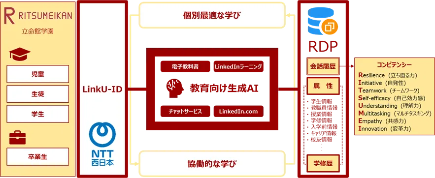 立命館とNTT西日本が協力して、学生や卒業生の学びを可視化し、高度な生成AIを用いて個別最適な学びの機会を提供します。具体的には、生成AIと電子教科書、LMSのデータを連携させ、学習者一人ひとりの能力を引き出す仕組みを構築します。これにより、学習者は自身の成果を感じやすくなり、学習意欲を高めることが期待されます。