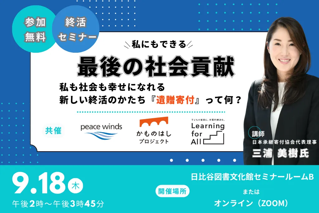 終活における新たな選択肢として注目を集めている「遺贈寄付」。この寄付の形式を通じて、私たちの人生の最後に社会へどのような貢献ができるのかを学ぶセミナーが、9月18日に開催されます。このセミナーは、認定NPO法人ピースウィンズ・ジャパンが主催し、知識と洞察を持つ講師を迎え、参加者が気軽に学べる場を提供します。
