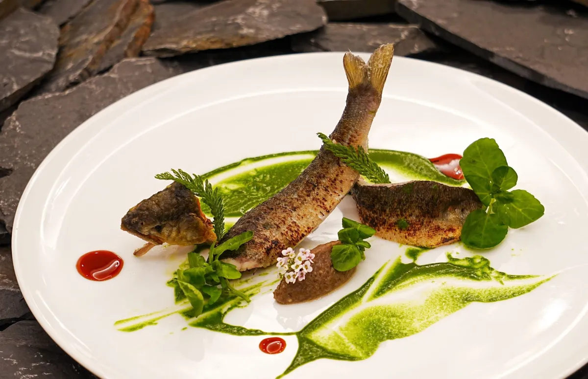 メインには、岩手県産の鮎のコンフィとフュメ焼き茄子をお楽しみいただきます。鮎独特の風味をフレンチスタイルで仕上げたこの料理は、鮎のおいしさをまるごと楽しむことができます。