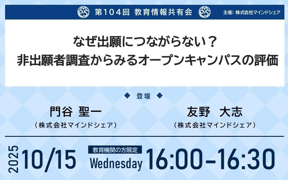 2025年10月15日(水)、株式会社マインドシェアが主催する「なぜ出願につながらない?非出願者調査からみるオープンキャンパスの評価」に関するセミナーが開催されます。このセミナーは、教育機関に所属する方々限定で、オープンキャンパス参加者の増加傾向が出願につながらない理由を探る貴重な機会です。このテーマは、近年多くの大学が抱えている悩みでもあり、教育関係者にとって見逃せない内容となっています。