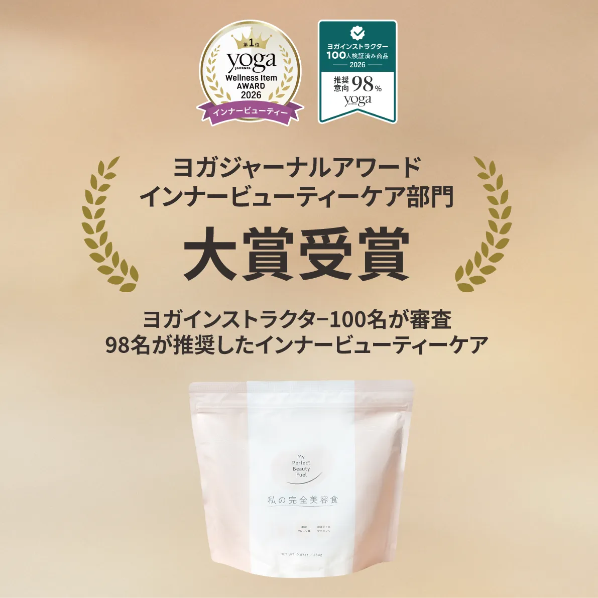 As-meエステール株式会社から展開された国産大豆プロテイン『私の完全美容食』が、名高いヨガジャーナルアワード2026においてインナービューティーケア部門の大賞を受賞しました。この賞は、現役のヨガインストラクター100名が審査し、実際に商品を試用の上で評価を行った結果、98名からの推奨を受けるという素晴らしい成果を収めました。