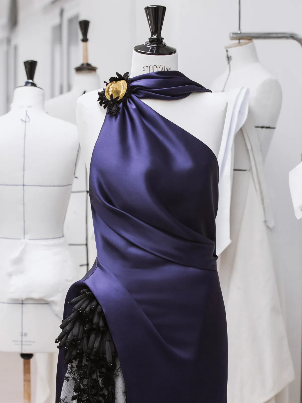 EJAEが選んだのは、細かなレースとチュールが融合したインディゴサテンドレス。色合いは深みのあるインディゴで、特に夜の照明の下でその美しさが際立ちます。このドレスには、華やかな刺繍で飾られた花房や、ディオールの「メダリオン」ブローチが施され、シンプルでありながらも豪華な印象を与えています。