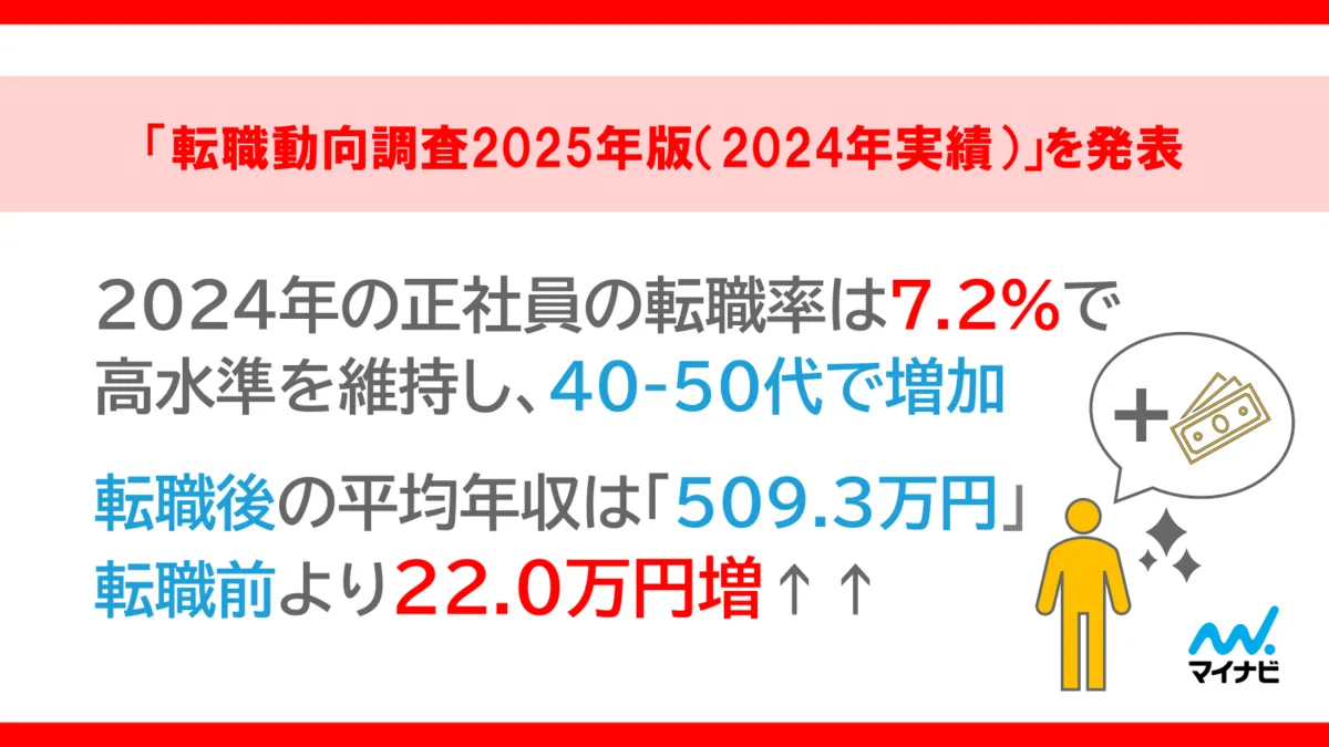 株式会社マイナビが実施した『転職動向調査2025年版(2024年実績)』の結果が公表されました。調査は2024年の間に転職を行った正社員1,500名を対象に行われ、転職者の現在の状況や変化の傾向が把握されました。特に注目すべきは、40代から50代の働き手が転職市場において活発に動いていることです。