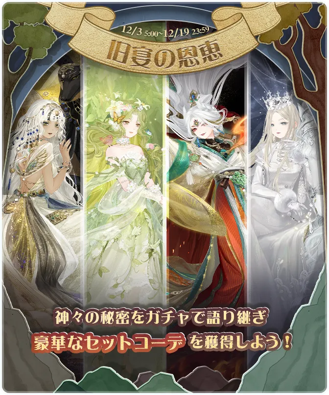 このイベントでは、神々の秘密をガチャで語り継ぐ形式で、トータル8着のセットコーデを手に入れることができます。特にオンラインで上位200名には限定アイコンフレームがプレゼントされるので、熱心なユーザーには堪らない内容です。期間は12月3日から12月19日まで。