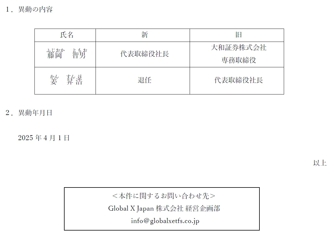 本日、Global X Japan株式会社は取締役会にて新たな代表取締役社長の異動を決定しました。この動きは、同社のさらなる成長を目指す戦略の一環として行われました。