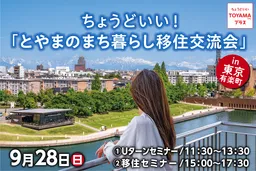 富山県の中心、富山市では、令和7年9月28日(日)に「ちょうどいい!とやまのまち暮らし移住交流会」を東京交通会館で開催します。この交流会は主に、富山県に興味を持つ方々に向けて、富山市の暮らしの魅力をお伝えする絶好の機会です。富山市は北陸新幹線を利用すれば東京まで約2時間というアクセスの良さを誇ります。仕事や住まい、子育て、公共交通といった日常生活に必要な機能を兼ね備え、さらにゆったりとした空間と時間を提供してくれる「ちょうどいい」地方都市です。
