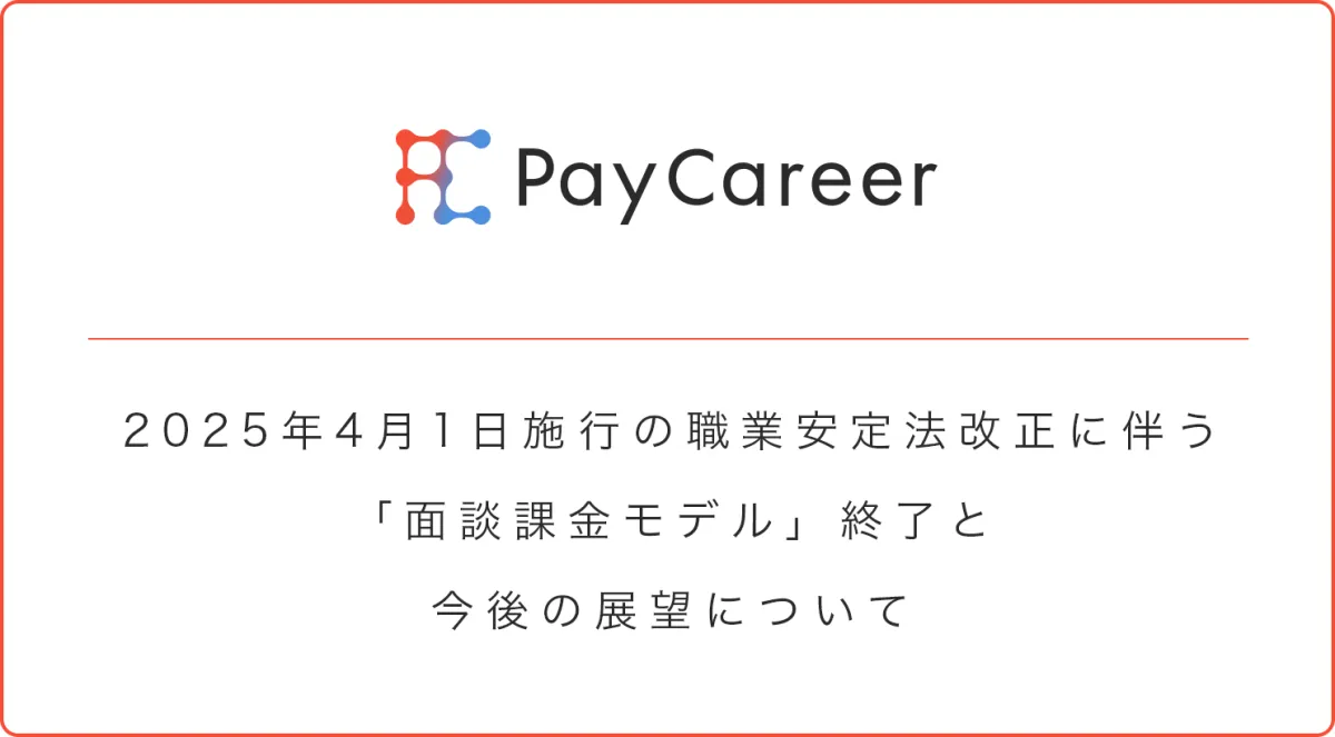 株式会社PayCareer(ペイキャリア)が、2025年4月から施行される職業安定法改正に伴い、「面談課金モデル」というこれまでのシステムを終了します。これは、企業と求職者の間の「本気の出会い」を目指すスカウト型面談サービスの大きな転換点です。