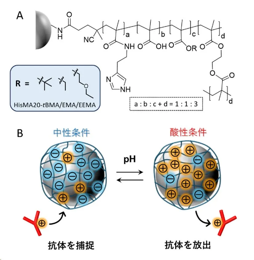 抗体精製では従来、プロテインAカラムが広く使用されてきました。しかし、この方法には低安定性や高コストという欠点があり、さらに低いpH条件での溶出により、抗体の活性が損なわれるリスクも存在します。これに対し、慶應義塾大学の研究グループは、合成高分子によってプロテインAの抗体結合領域を模倣した新しい手法を開発。これにより、従来の方法に比べて様々な利点を持つ抗体精製が可能になったのです。