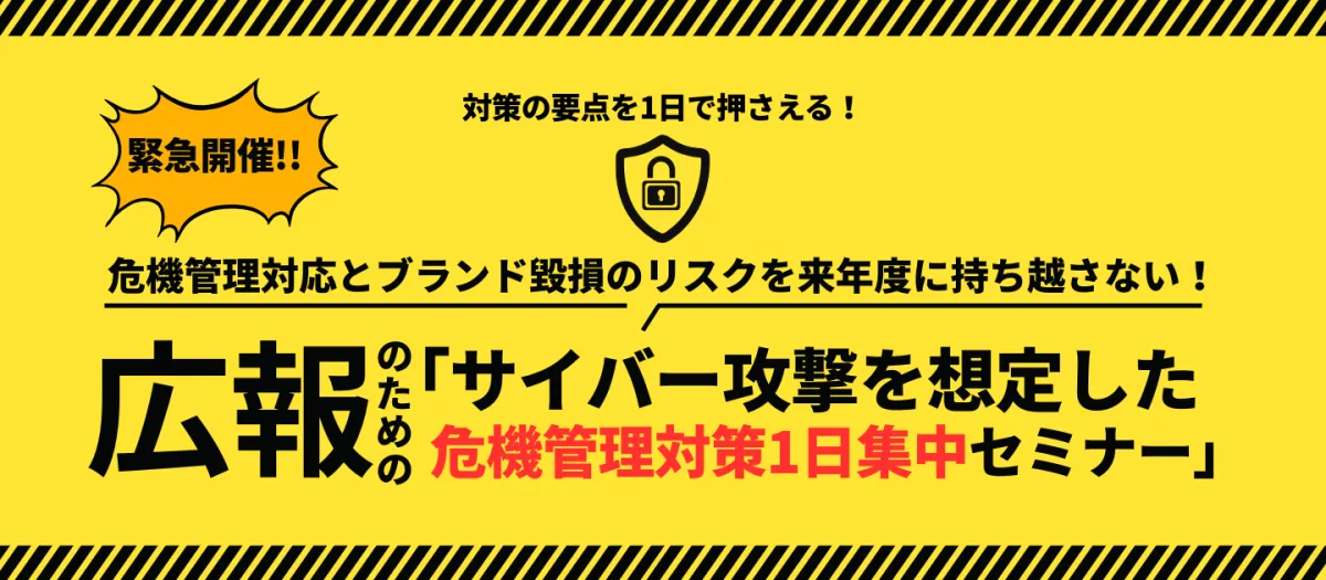 近年、大手企業を対象としたサイバー攻撃の被害が多発しており、次に標的になるのは自社である可能性が高いと言えます。攻撃を防ぐことよりも、発生した際にどのような情報を発信し、どのような判断を下すのかが企業の評価に大きく影響します。このセミナーでは、このような緊急時に広報が果たすべき役割を再認識することを目的としています。