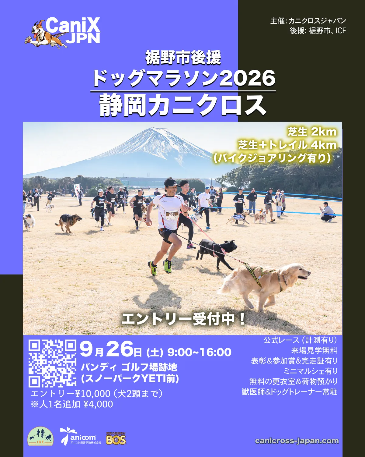 2026年9月26日、静岡県裾野市にて新感覚のドッグマラソン『静岡カニクロス』が開催されます。このイベントは、日本で注目を集めるカニクロスという犬と一緒に走るクロスカントリースポーツの大会で、富士山の美しい自然を背景に行われます。