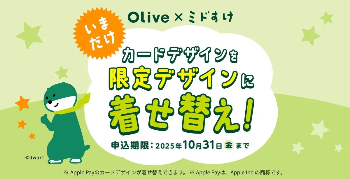2025年10月1日から、三井住友銀行が新たに展開するキャンペーンで、人気キャラクター「ミドすけ」がApple Payの限定カードデザインとして登場します。この機会に、Oliveを利用しながらお好みのデザインに着せ替えることができるチャンスです!