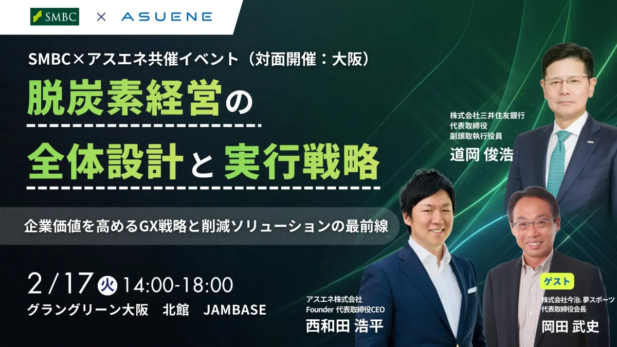 2026年2月17日、大阪市において、アスエネ株式会社と三井住友銀行の共催による特別イベントが開催されます。このイベントのテーマは「脱炭素経営の全体設計と実行戦略」。企業が直面する経営課題の中で「GX(グリーントランスフォーメーション)によって企業価値は向上可能なのか?」という興味深い問いを中心に、様々な議論が交わされることが期待されています。