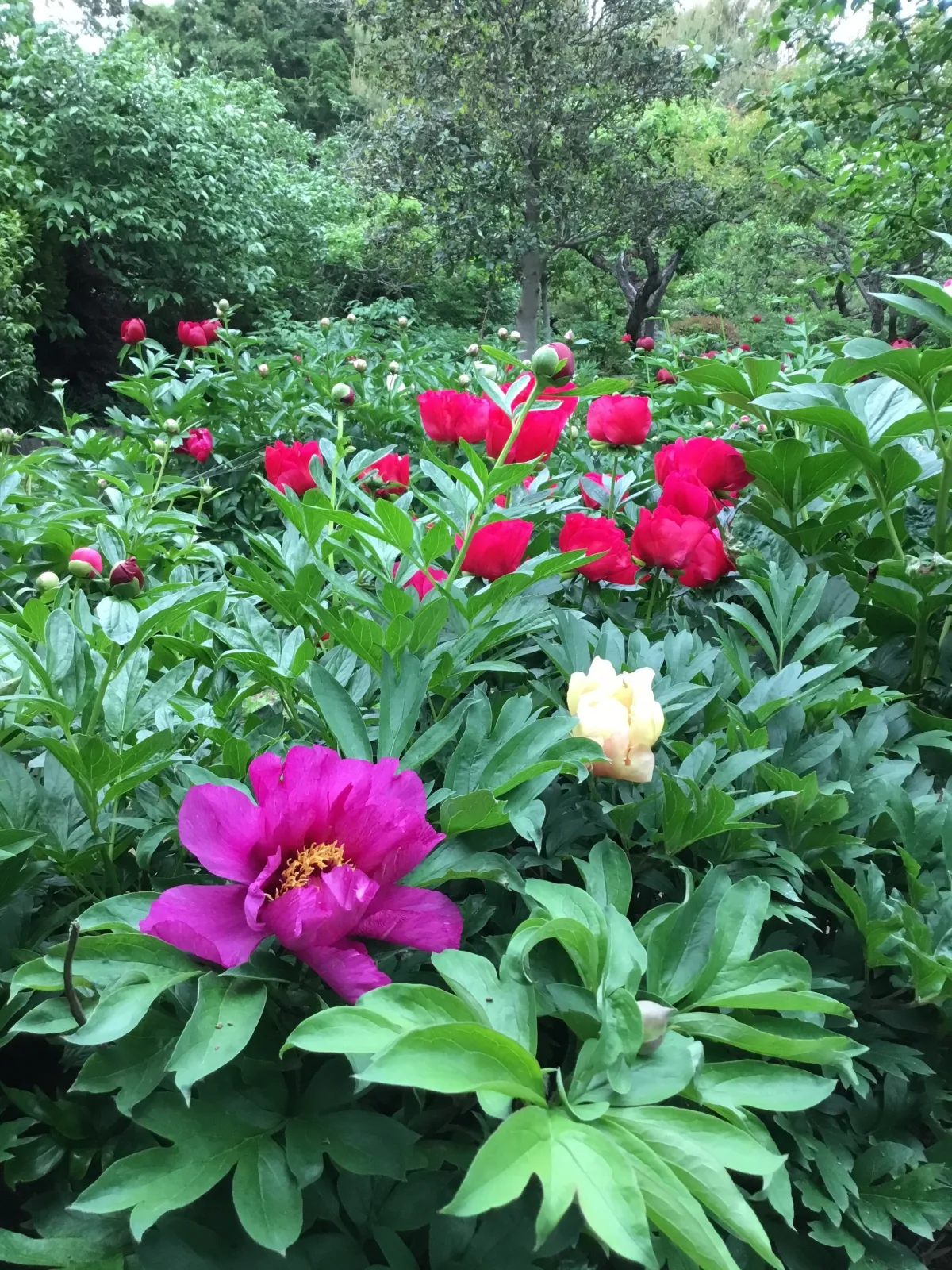 春牡丹が終盤を迎えると、スラリとした立ち姿で花を咲かせるシャクヤクは、その姿を人々に見せ始めます。特に注目が集まるのが、牡丹とシャクヤクの交配種であるハイブリッドシャクヤクです。これらの多様な品種は、特有の形状や色合いを持ち、見ごたえがあります。春の訪れを告げるように、その色彩は境内全体を明るく照らします。