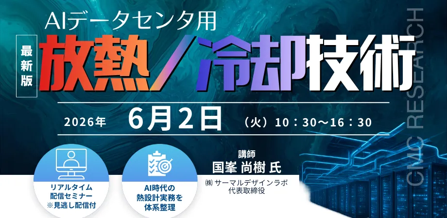 2026年6月2日(火)、株式会社シーエムシー・リサーチ主催のオンラインセミナー「AIデータセンタ用放熱/冷却技術」が開催されます。このセミナーでは、AIの進展に伴い急増するデータセンタの熱問題に焦点を当て、実践的な解決策を学ぶことができます。
