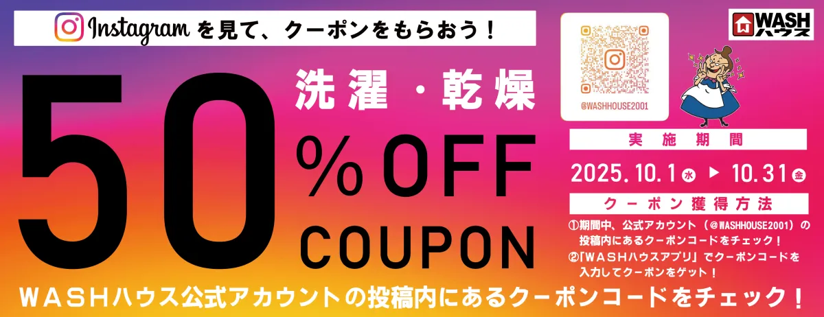 このキャンペーンは、2025年10月1日(水)から10月31日(金)までの期間限定です。参加方法は非常に簡単。まず、WASHハウスのInstagram公式アカウントをフォローし、クーポンコードを見つけてください。その後、WASHハウスアプリにそのクーポンコードを入力するだけで、洗濯と乾燥が50%OFFになるクーポンを受け取ることができます。