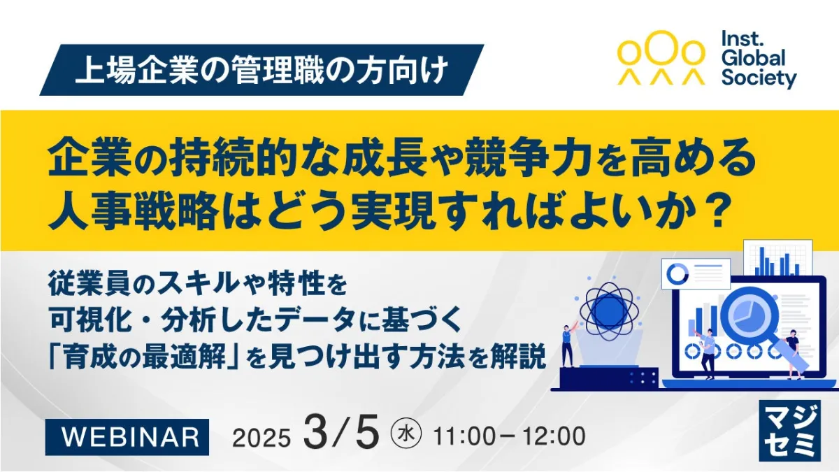 企業が持続的な成長を遂げるためには、人事戦略が経営戦略としっかり結びついている必要があります。この度、企業の管理職向けに「企業の持続的な成長や競争力を高める人事戦略」をテーマとしたウェビナーを開催いたします。このセミナーでは、人材育成の課題や具体的な解決策に焦点を当て、参加者にとって有意義な情報を提供します。