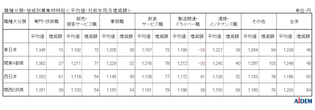 一方、西日本エリアの平均時給は1,186円で、前年同月比63円の増加となりました。ここでも専門・技術職が1,352円で高い水準を保ち、前年同月比61円の増加が見られました。他の職種も全て前年同月比で上昇しており、製造関連・ドライバー職は1,172円、事務職は1,145円となっています。