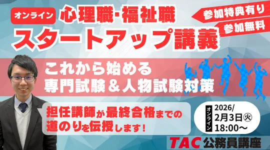 TAC株式会社は、心理職・福祉職の公務員試験を目指す方々のために、特別に設けた『心理職・福祉職 公務員スタートアップ講義』を2月3日火曜日の18:00から開催します。この講義は、合格者の経験を直接聞くことができる貴重な機会であり、試験対策への最初のステップとして活用されています。