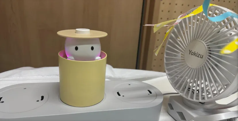 「ぽっちゃん」は、ボタンを押すことで人間の感情に反応し、例えば「暑いなぁ」といった声を発します。この発言を受けて人がロボット上部のスイッチを押すと、連動する家電が作動し、その行動に対してロボットは「ありがとう」と感謝の気持ちを表します。このように一方的ではなく、双方向的なコミュニケーションが行われることが、ぽっちゃんの最大の特徴です。