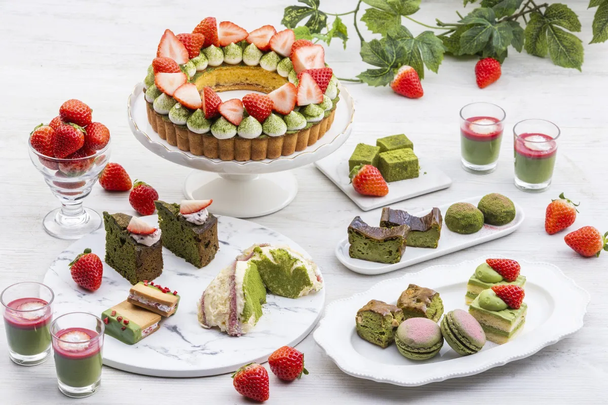 パインテラスでは、いちごとお茶をテーマにした魅力的なスイーツがビュッフェスタイルで提供されます。たとえば、いちごクリームがサンドされた抹茶チョコのバターサンドや、緑茶とピスタチオ、いちごを使ったスポンジケーキなど、多彩なラインナップが揃います。また、抹茶のバスクチーズケーキやいちごタルトも登場し、訪れる人々に新たな味わいを提供します。