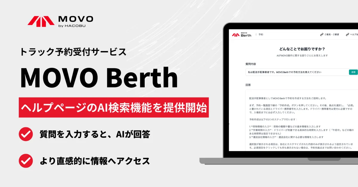株式会社Hacobuが展開するトラック予約受付サービス「MOVO Berth(ムーボ・バース)」が、ヘルプページにAI検索機能を実装しました。この新機能は、ユーザーが必要な情報に直感的にアクセスできるように設計されています。物流業界でも依然として陳腐化した手法が多く見受けられる中、Hacobuはデジタル技術を活用することで新たなサポート体験を提供します。