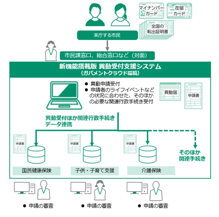 「書かないワンストップ窓口」は、住民が一つの窓口で異動関連の申請や他の行政手続きを行える仕組みです。これにより、手書きでの申請書記入が不要になり、自治体職員の負担も軽減されます。例えば、転出証明書に記載された情報をシステムが自動で取り込み、申請書に反映させる機能が搭載されます。これにより、住民はわずらわしさから解放され、手続きがより便利になります。