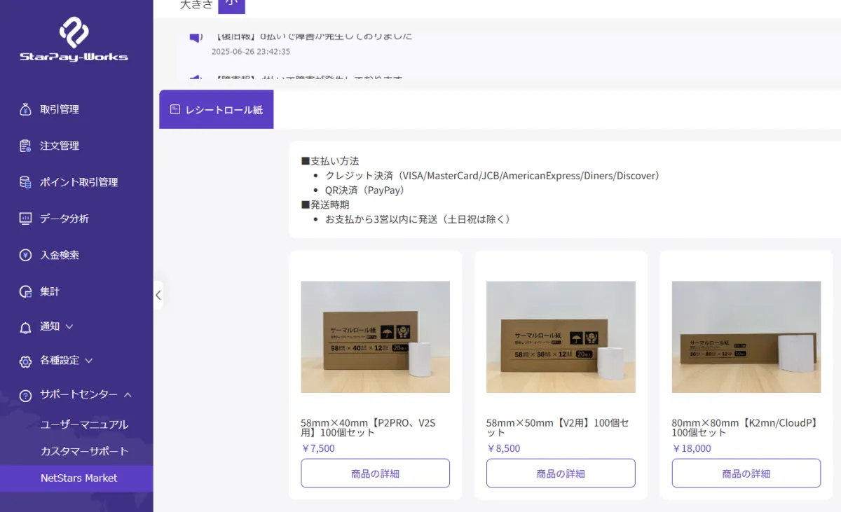 今回のサービスの第一弾として、決済端末用のレシートロール紙の販売をスタートしました。このアイテムは対面決済を行う際に不可欠なものであり、リーズナブルな価格で提供されています。加盟店は、コストの削減を実現しながら、必要な商品を迅速に手に入れることができます。