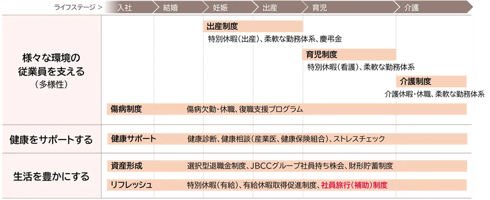 JBCCグループでは、フルフレックス制の導入やテレワークの充実、シニア世代の活躍を促進する「極・匠プログラム」など、社員が能力を最大限に発揮できる環境作りを進めています。このような制度の中で、多様な働き方や生活スタイルに合わせた旅行メニューを用意することで、社員が共に創造的に働くための場を提供しています。