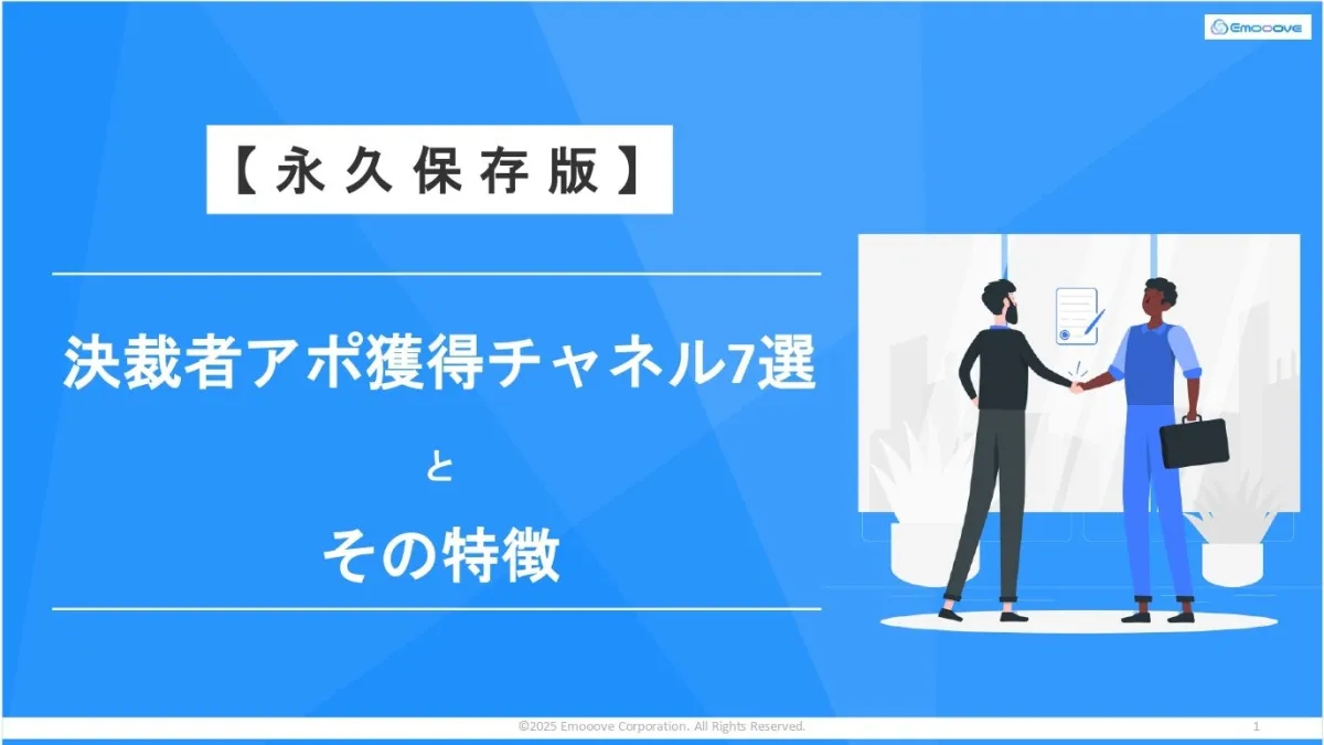 株式会社Emooove(本社:東京都渋谷区)、代表取締役CEOの藤澤諒一が提供する新たな営業手法が注目を集めています。BtoB営業における成功の鍵は、商談の質や受注率が「誰に」アプローチするかに大きく左右されるため、適切なチャネルを見つけることが重要です。Emoooveの最新ホワイトペーパー「【永久保存版】決裁者アポ獲得チャネル7選とその特徴」では、特に大手企業の役員や資金調達済みのスタートアップのCXOといったキーマンにアクセスするための有力なチャネルを7つ厳選、各施策の特徴やメリット・デメリット、実際の運用例までを詳細に解説しています。