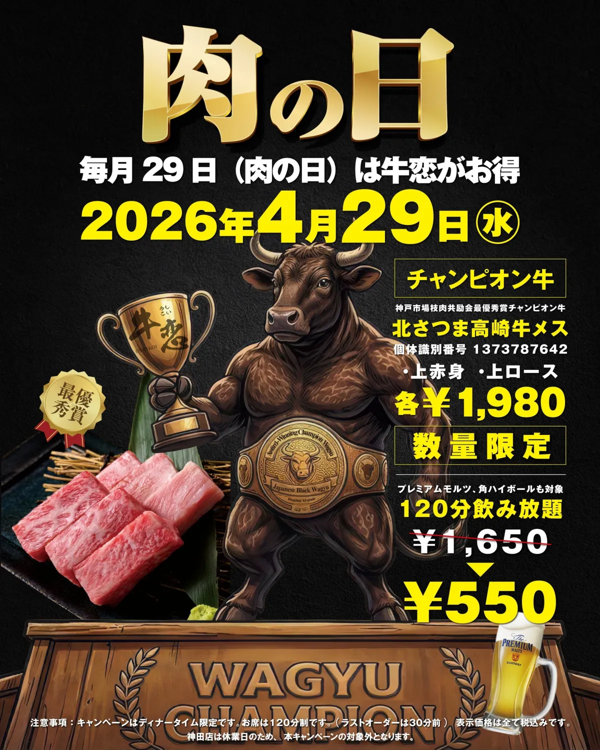 焼肉好きの皆さんに朗報です!東京を中心に展開する人気焼肉店『牛恋』が、2026年4月29日の「肉の日」に特別キャンペーンを実施します。この日は、神戸市場枝肉共励会で最優秀賞を受賞したチャンピオン牛が数量限定で提供される贅沢な日となります。