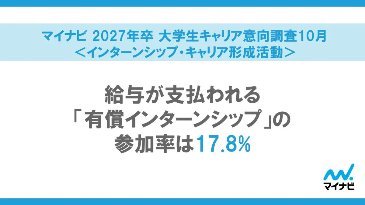 さらに、給与が支払われる「有償インターンシップ」の参加率は17.8%という結果が出ました。このインターンシップに参加した理由として、「希望する業界・職種を体験したい」との声が44.6%と最も多く、続いて「実務経験を積みたい」という意見が43.8%です。
