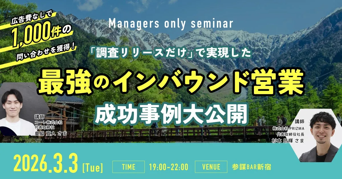 株式会社経営参謀は、2026年3月3日(火)に経営者を対象にした勉強会を開催します。イベント名は『広告費なしで1,000件の問い合わせを獲得!「調査リリースだけ」で実現した最強のインバウンド営業成功事例』。講師には、コーレ株式会社の代表取締役、奥脇 真人氏が登壇します。