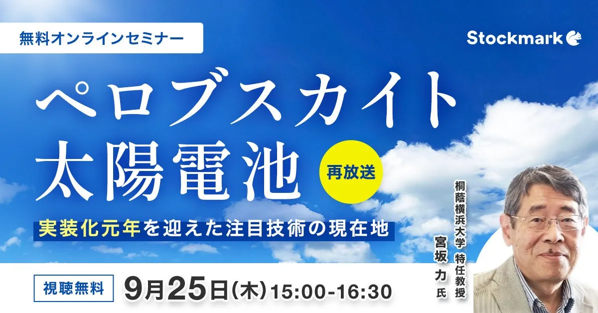 9月25日、ストックマーク株式会社が主催するオンラインセミナー、「ペロブスカイト太陽電池 - 実装化元年を迎えた注目技術の現在地」が再放送されます。本セミナーは、Next Generation Solar Cellとして国内外で注目されるペロブスカイト太陽電池の進展とその実用化に向けた課題を取り上げます。