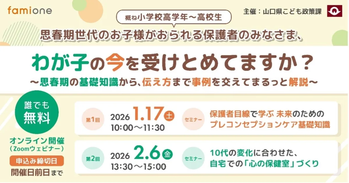 山口県では、思春期のお子さんを持つ保護者向けに、無料でオンラインセミナーを開催します。日程は2026年1月17日(土)と2月6日(金)で、参加申し込みが現在受け付け中です。このセミナーの主催は、東京都渋谷区に本社を置く株式会社ファミワンで、地域の保護者が我が子の思春期について学ぶ貴重な機会を提供します。