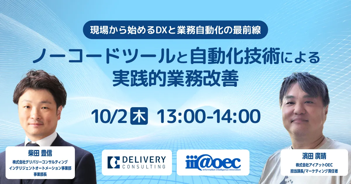 データリテラシーを向上させ、企業のデータドリブンカンパニーへと導く活動に取り組む株式会社デリバリーコンサルティングが、株式会社アイアットOECとの共催で特別なWEBセミナーを開催します。このセミナーは、現場からスタートするデジタルトランスフォーメーション(DX)と業務自動化について学ぶ機会です。