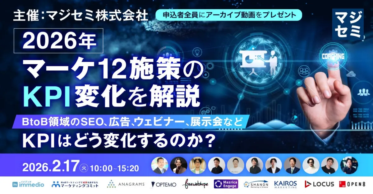 カイロスマーケティング株式会社は、2026年に求められる新しいマーケティングの評価基準についてオンラインセミナーを開催します。このセミナーは、マジセミ株式会社によって主催され、BtoB領域の重要な施策がどう変化するのかを探る内容となっています。
