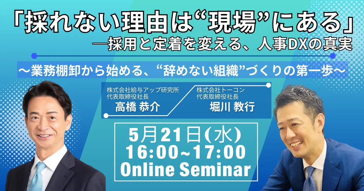 2023年10月に、株式会社給与アップ研究所と株式会社トーコンが共催するオンラインセミナー「採れない理由は“現場”にある ─ 採用と定着を変える、人事DXの真実 ─」が開催されました。このセミナーは、現代の企業が直面する採用と定着に関する課題を掘り下げ、解決策を共に模索する貴重な機会となりました。