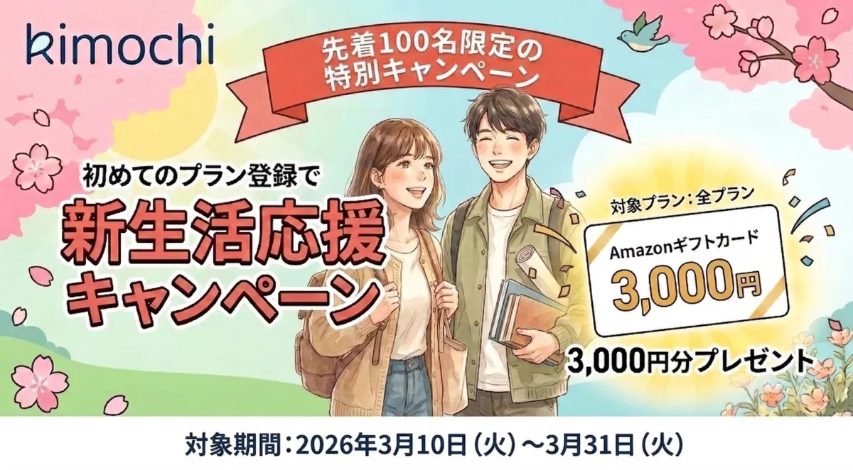 新年度が近づくこの季節、ほとんどの人にとって新生活がスタートします。入学や就職、転職、引っ越しなど、環境が大きく変わる中での期待感に満ちた気持ちと同時に、不安やストレスも抱えることが多いのではないでしょうか。そんな中、オンラインカウンセリング「Kimochi」が新生活を応援する「新生活キャンペーン」を実施しています。このキャンペーンでは、初めてプラン登録を行った100名に最大13,000円分のAmazonギフトカードをプレゼントします。