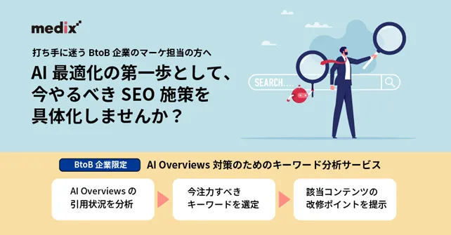 2022年に登場したChatGPTをはじめとする生成AIエンジンの普及に伴い、2024年に導入された「AI Overviews」は、日本市場でも影響が顕著になっています。BtoB企業のマーケティング担当者は、ゼロクリックによる流入減や、従来のSEOが通用しない状況に直面しています。このような変化の中で、どのように対策を行うべきか、明確な打ち手が見えにくくなっています。メディックスの新サービスは、この新たな環境に対応しつつ、従来のSEO施策も考慮した上での具体的なアプローチを提供します。