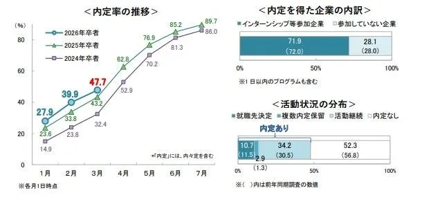 株式会社キャリタスが実施した調査によると、2026年3月卒業予定の大学3年生(理系大学院修士課程1年生含む)の内定率が47.7%に達しました。この数字は、前年同期の43.2%から4.5ポイントの上昇を示しています。調査は2025年3月1日から6日にかけて行われ、1,105名の学生が回答しました。