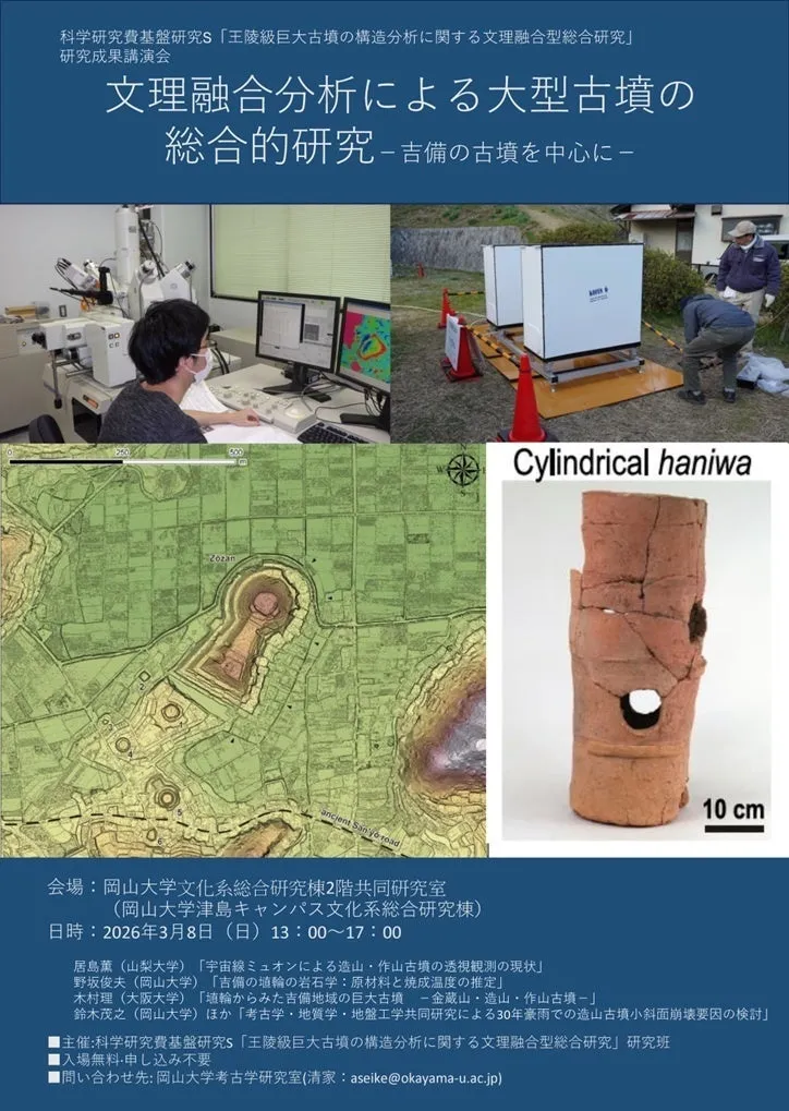 国立大学法人岡山大学では、2026年3月8日に「王陵級巨大古墳の構造分析に関する文理融合型総合研究」成果講演会が行われます。この講演会は、古墳についての様々な分析とその結果を共有する場となります。イベントは岡山大学の津島キャンパスにて、午後1時から5時までの予定で、多くの方々の参加が期待されています。