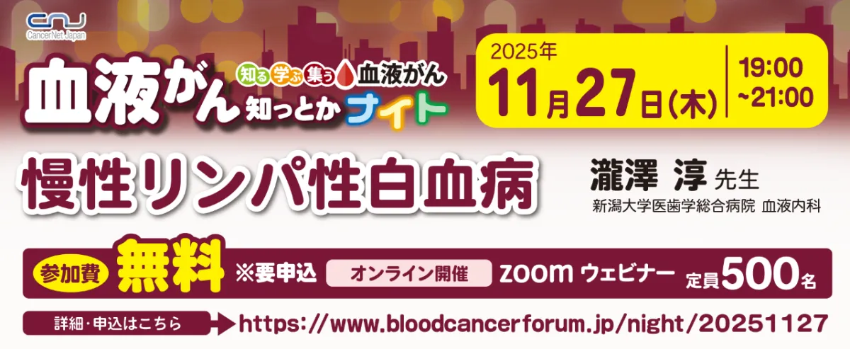 認定NPO法人キャンサーネットジャパンが主催する「血液がん知っとかナイト」が、2025年11月27日(木)に慢性リンパ性白血病(CLL)をテーマにしたオンラインセミナーを開催します。本セミナーは全国どこからでも参加可能で、海外からの参加者も大歓迎です。今回は第21回の開催となります。