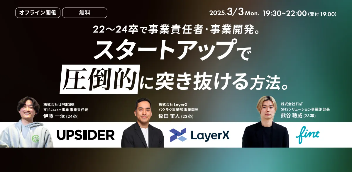 スタートアップの世界で圧倒的な成長を遂げる方法を学びたい方々に、特別なオフラインイベントが開催されます。このイベントは、株式会社FinTが株式会社UPSIDER、株式会社LayerXと共に主催するもので、2025年3月3日(月)19:30から、東京都渋谷区にあるFinTのオフィスで行われます。