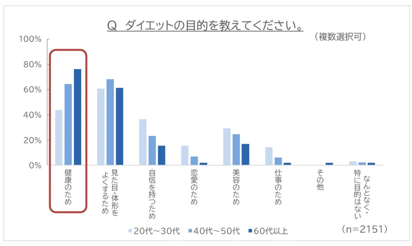 ダイエットに取り組む理由はさまざまです。ある人は見た目を整えたくて、またある人は健康のために行動します。大正製薬が3,113人を対象に行った調査によれば、69%がダイエットを経験しており、その目的は「健康のため」が最も多いという結果が出ています。このことからも、ダイエットの目的は単なる体重の減少に留まらないことがわかります。