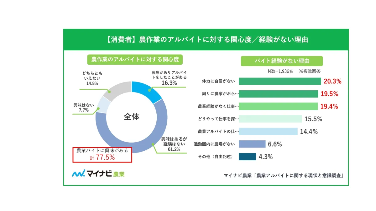 マイナビが実施した「農業アルバイトに関する現状と意識調査」によると、多くの消費者が農業アルバイトに興味を示す一方で、実際に経験したことがある人は少ないという矛盾した状況が浮かび上がりました。住友化学はこの状況を受け、「農mers」が消費者と農家のそうした非対称性を解消するために開発されているとしています。