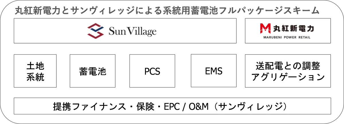 今回のフルパッケージ商品は、これらの課題を解決することを目的としています。具体的には、サンヴィレッジが蓄電池用の土地や系統権利の提供、さらに蓄電池(PCSやEMSを含む)の調達から建設(EPC)、運用・保守(O&M)までを一手に担います。一方、丸紅新電力は試運転や送配電のサポート、そしてアグリゲーション業務を担当します。