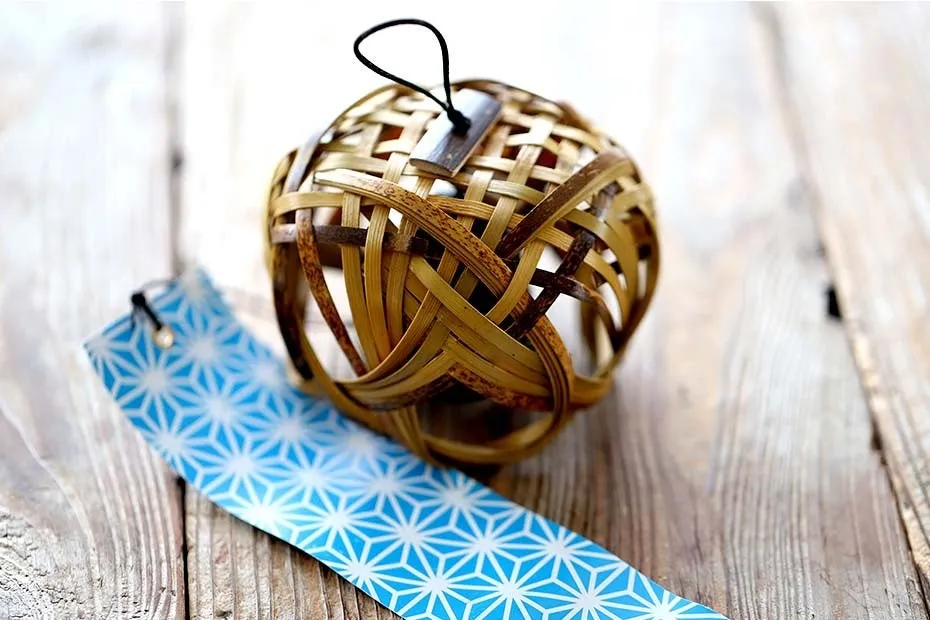 この風鈴は、虎竹の特有の模様を活かした作品です。波の形に編み込まれた「四海波」は、視覚的にも聴覚的にも、和の美を感じさせる独特の仕上がりになっています。和室や玄関先に飾ると、その落ち着いた色合いと形状が、緩やかな風とともに穏やかな音を運んでくれます。