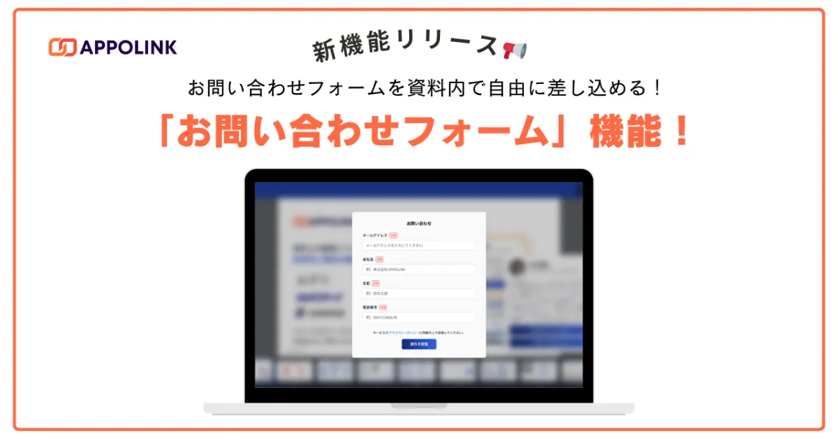 株式会社Owl Data(本社:東京都渋谷区、代表取締役:中村優太)は、そのサービス「APPOLINK」に新機能として、お問い合わせフォームの追加を発表しました。この機能は、資料内に自由にフォームを挿入できることが特長で、顧客が資料を見ながら行動を起こしやすくするよう設計されています。