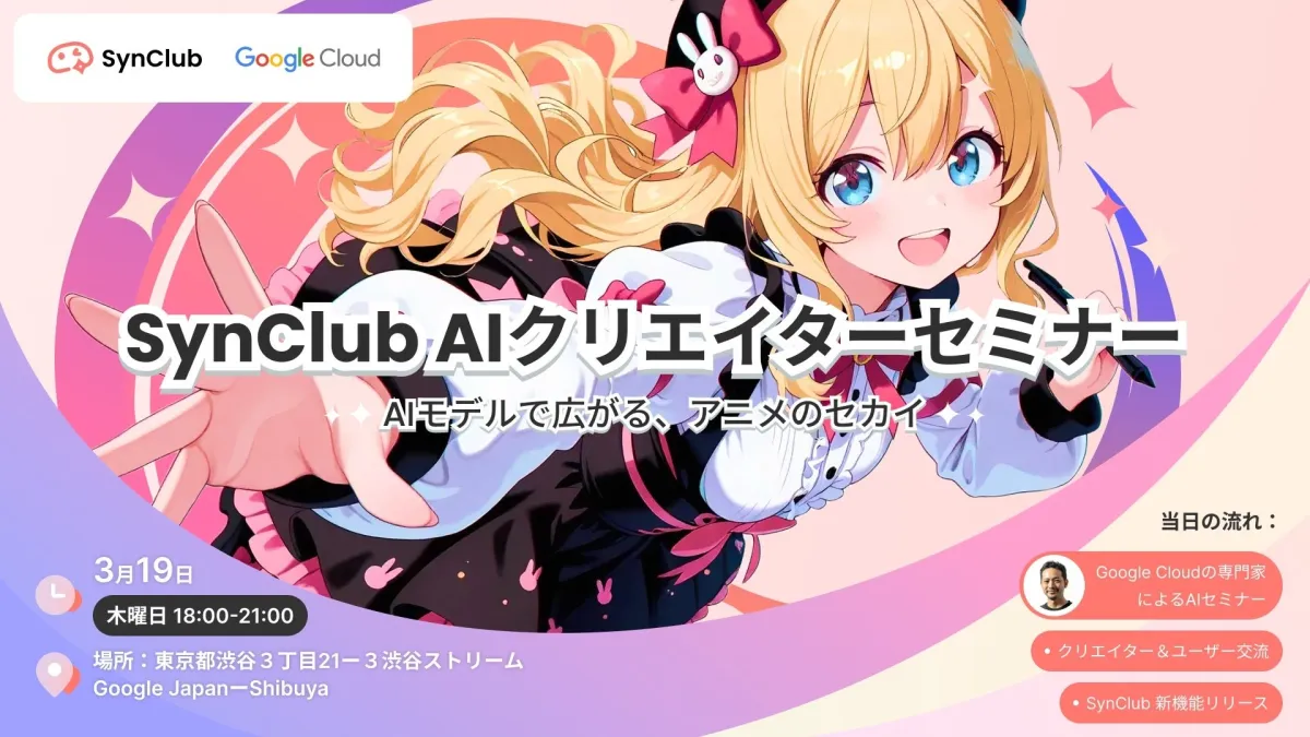 AIチャットアプリ「SynClub」とGoogle Cloudの協力による、「SynClub AIクリエイターセミナー」が2026年3月19日(木)に東京都渋谷区のGoogle Japan 渋谷本社で開催されます。このセミナーは、AIを活用したクリエイティブ制作に興味のある方々にとって、貴重な学びの場となるでしょう。